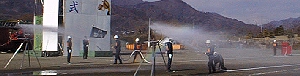 日産テクニカルセンターと田中貴金属工業の自衛消防団による屋内消火栓操法が実演されました。